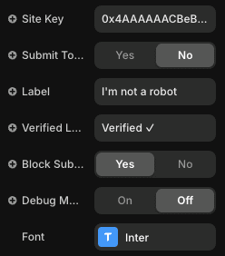 In the properties panel, simply input your public Cloudflare Turnstile Site Key. This connects your site to the bot protection. No coding required!